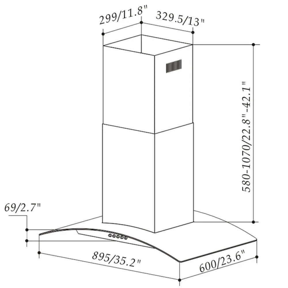 This is a 36 inch professional island stainless steel range hood. This hood is designed to be both elegant and powerful. This hood is made from 430 grade stainless steel and is a classic. Its durable construction, modern design - a exclusive - guarantee a range hood with a timeless design. Range hood come equipped with everything needed to easily install and use, including two 23.6-inch telescoping chimney pieces, allowing a fit for most ceilings between 7.5 and 8.5 feet.