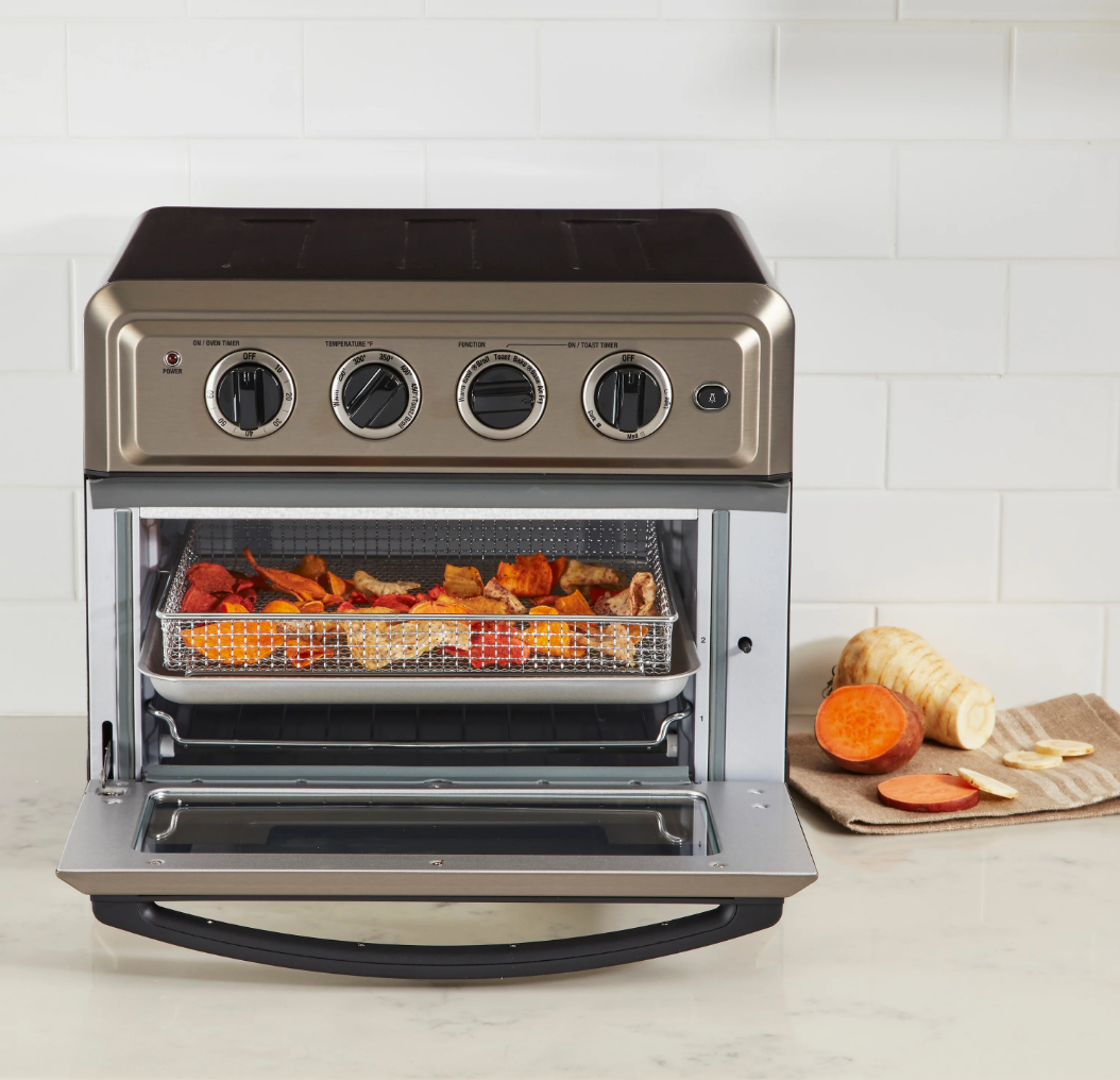 This unique kitchen workhorse is actually a premium full size toaster oven with a built-in air fryer. That means it not only bakes, broils, and toasts, it also lets you air fry right inside the oven. Air frying, which uses powerful ultra-hot air, is a healthier way to prepare delicious fried favorites, from wings to fritters to fries to shrimp. And since toaster ovens stay on the countertop, this fryer doesn’t have to move back and forth, from cupboard to counter. Enjoy the crunch without the calories and messy cleanup, with the AirFryer Toaster Oven!