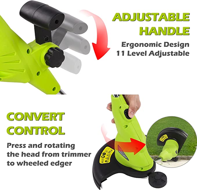 90° Rotatable: The edger rotates 90° and can be easily converted into a wheel edger to trim grass edge areas. Front plant guards wheel protect trees and plants while edging and trimming hard-to-reach places.
