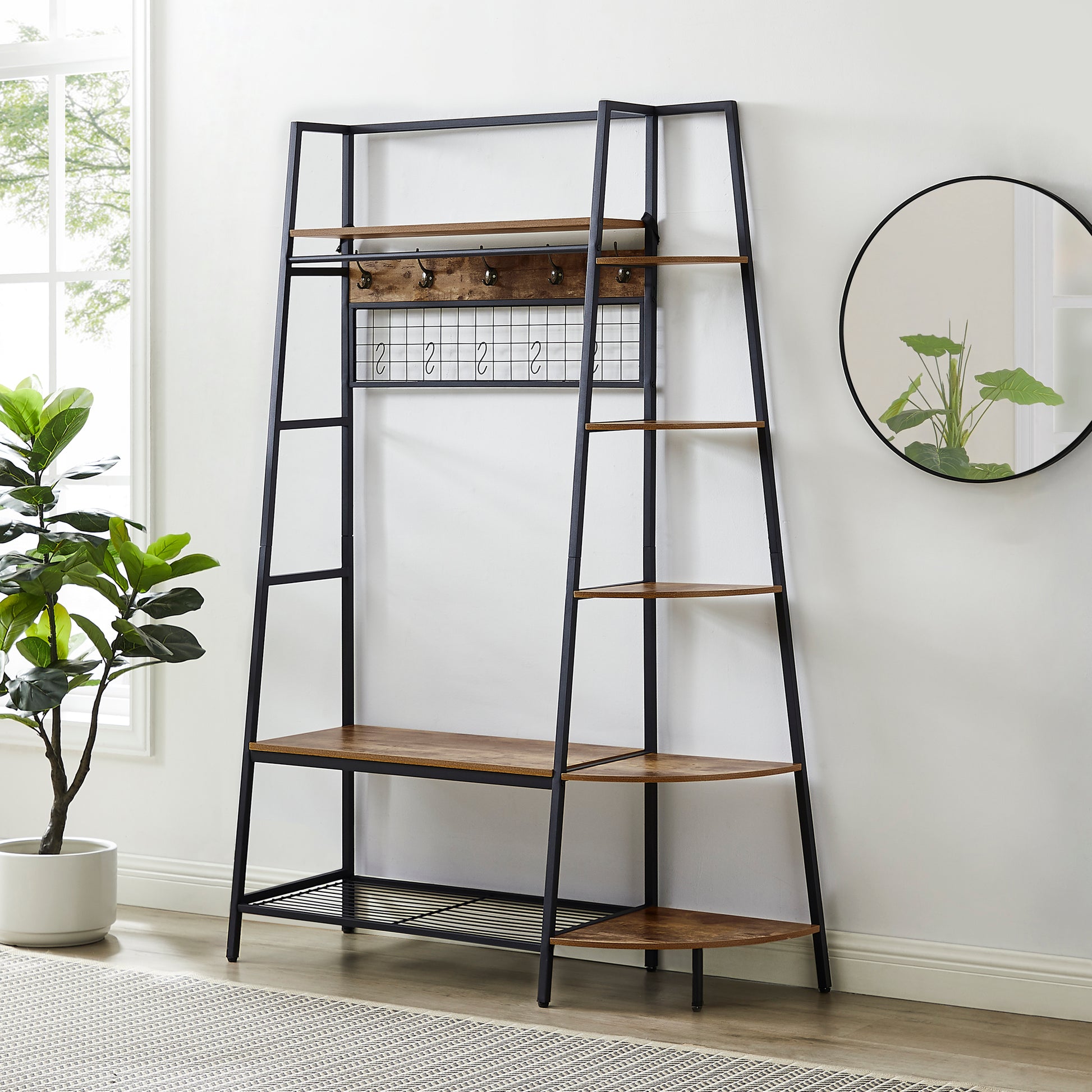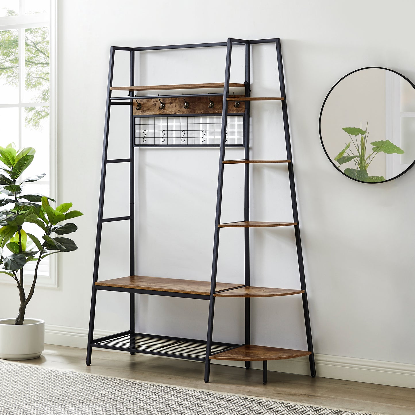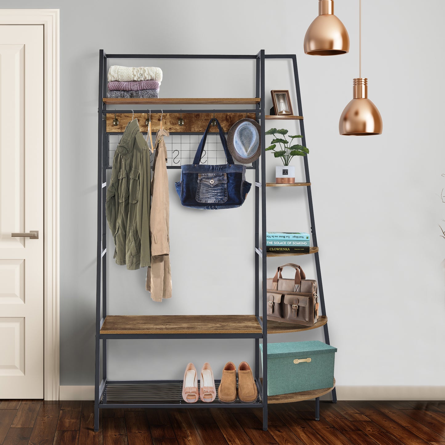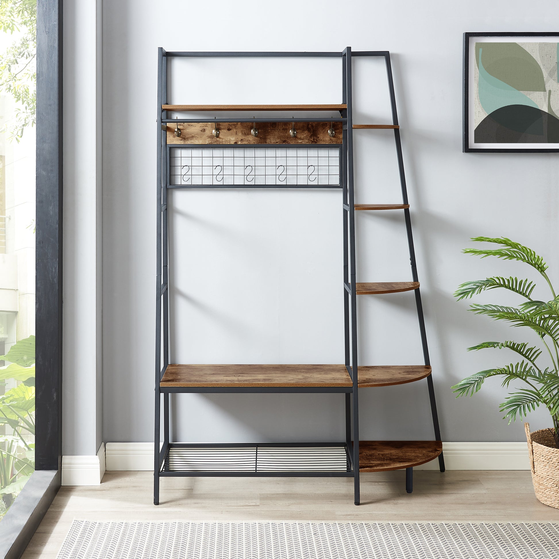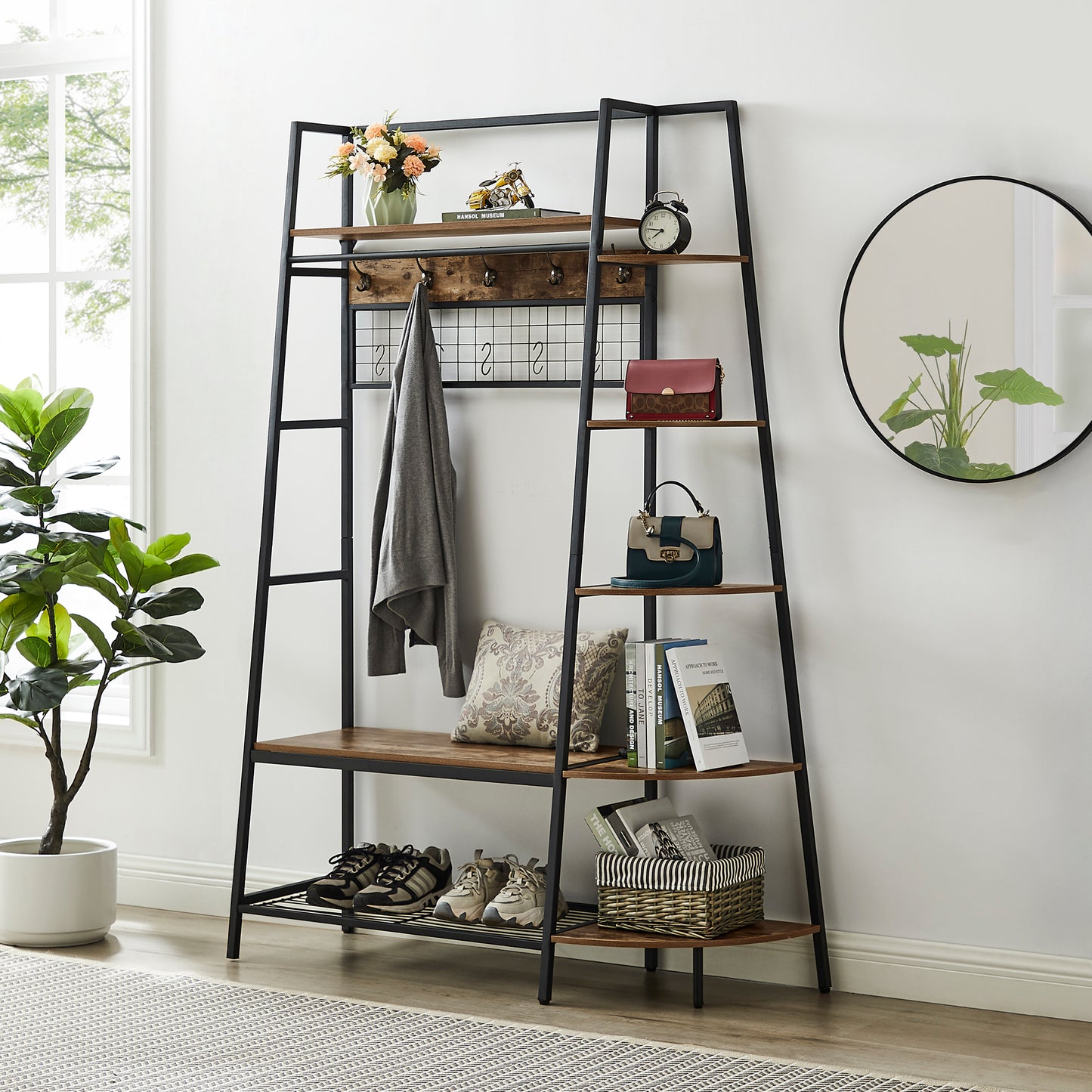 Inspired by the popular industrial trend of modern furniture, this tree-like coat rack is not only a functional storage unit, but also rich in visual appeal. Five coat hooks, a grid area with lots of S hooks, and a bench to take off your shoes, all these useful features, plus a ladder-style bookshelf for displaying some ornaments and interiors plant.