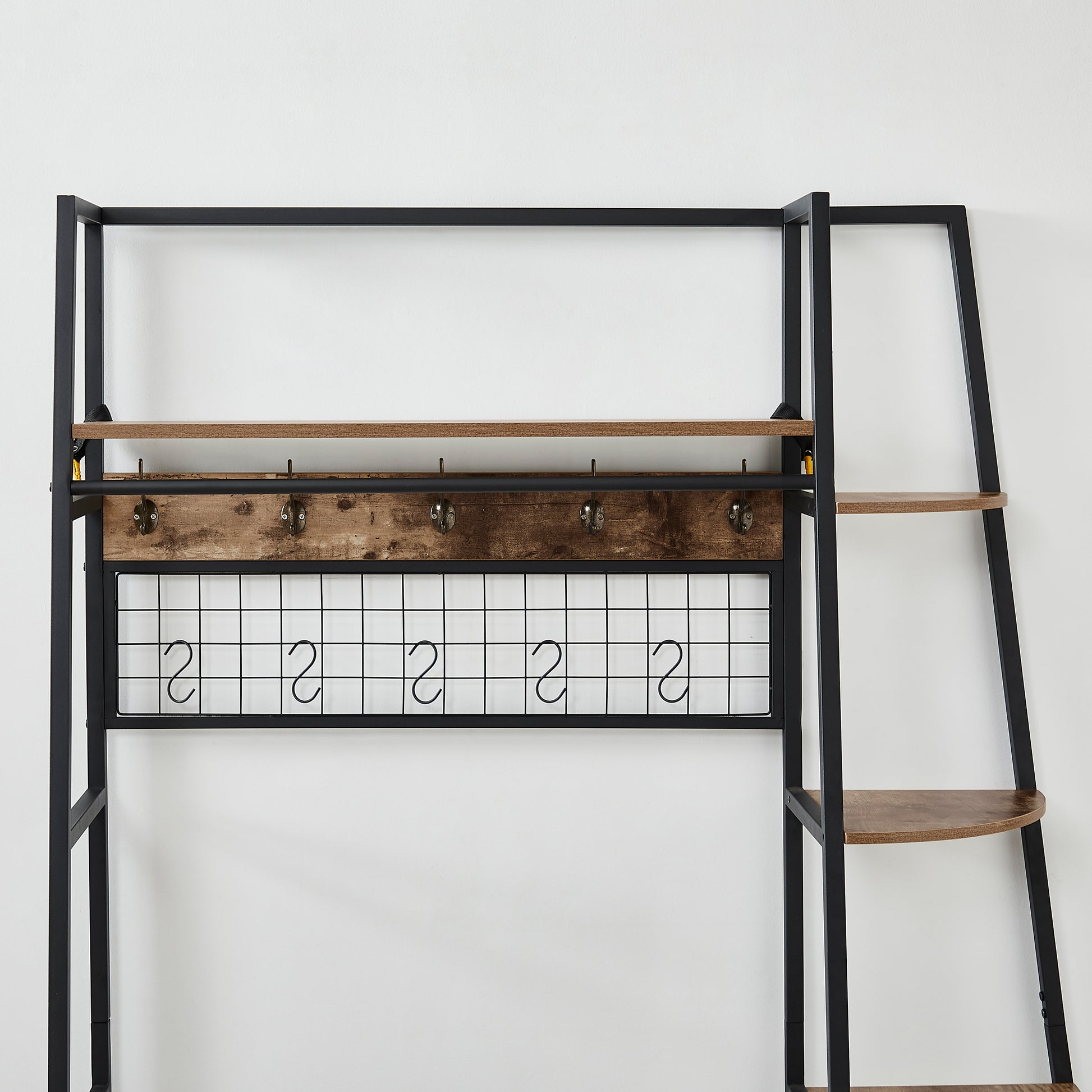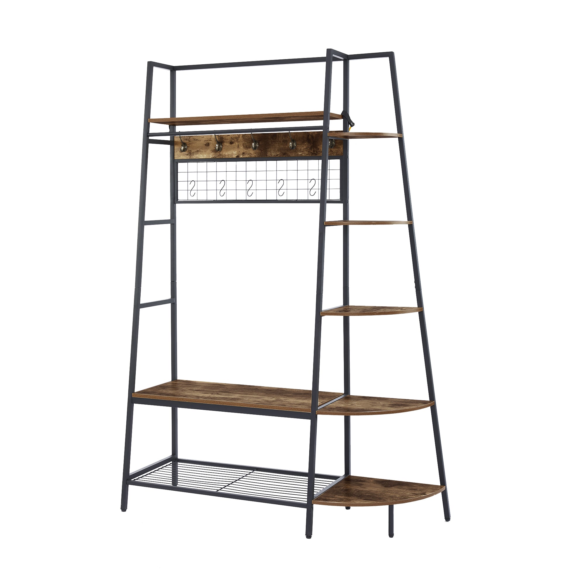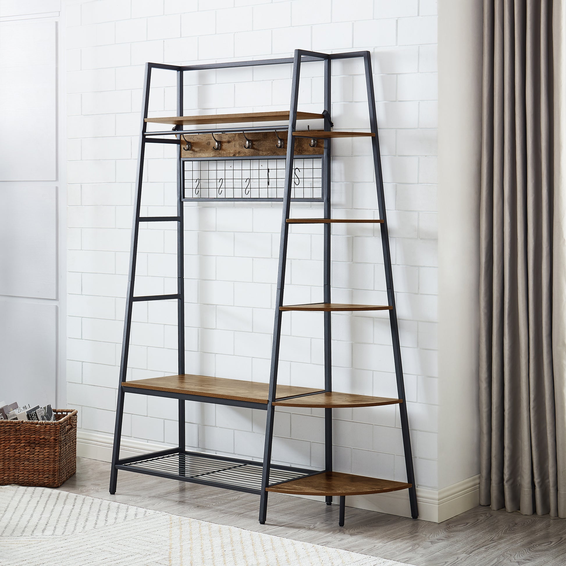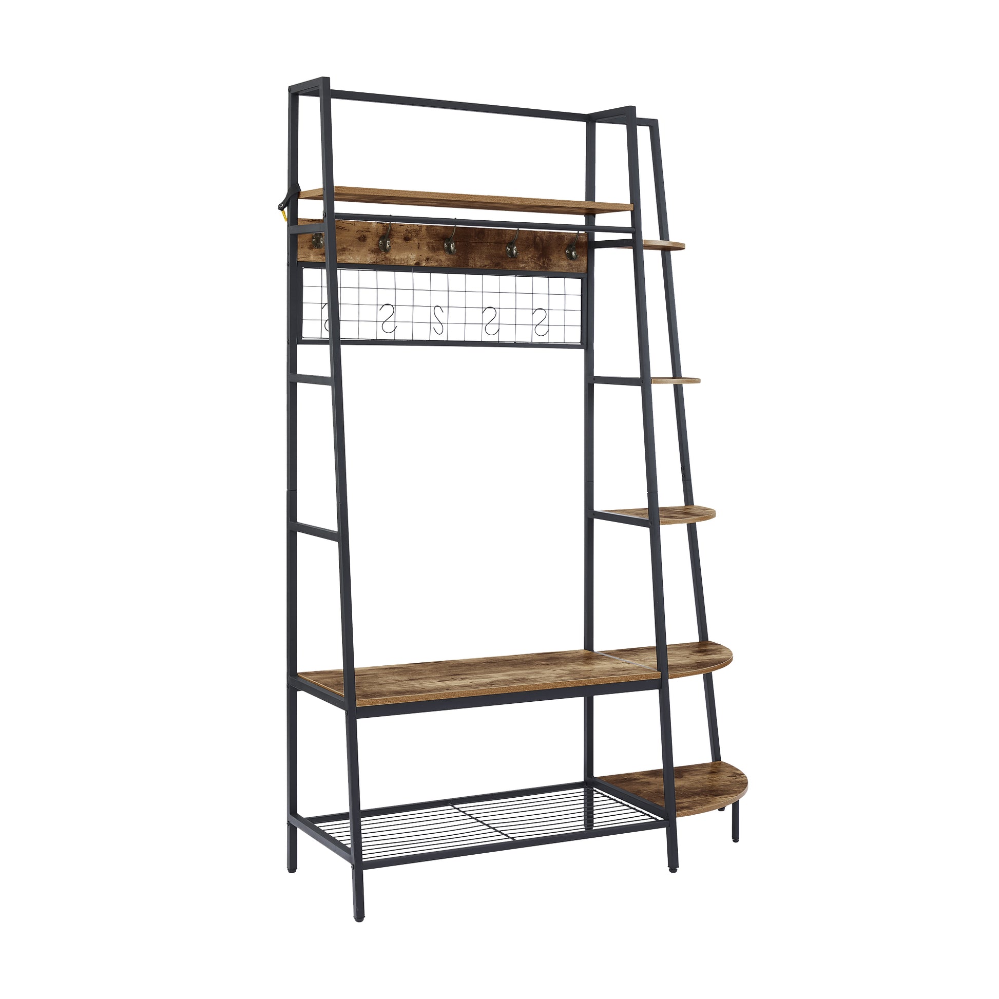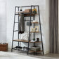 Inspired by the popular industrial trend of modern furniture, this tree-like coat rack is not only a functional storage unit, but also rich in visual appeal. Five coat hooks, a grid area with lots of S hooks, and a bench to take off your shoes, all these useful features, plus a ladder-style bookshelf for displaying some ornaments and interiors plant.