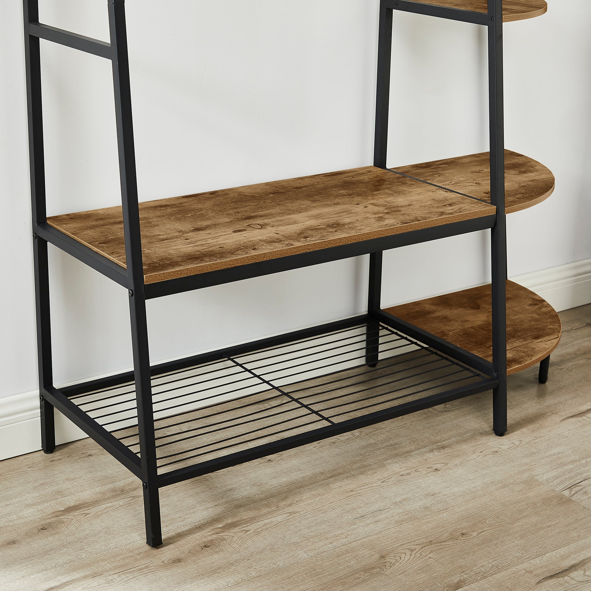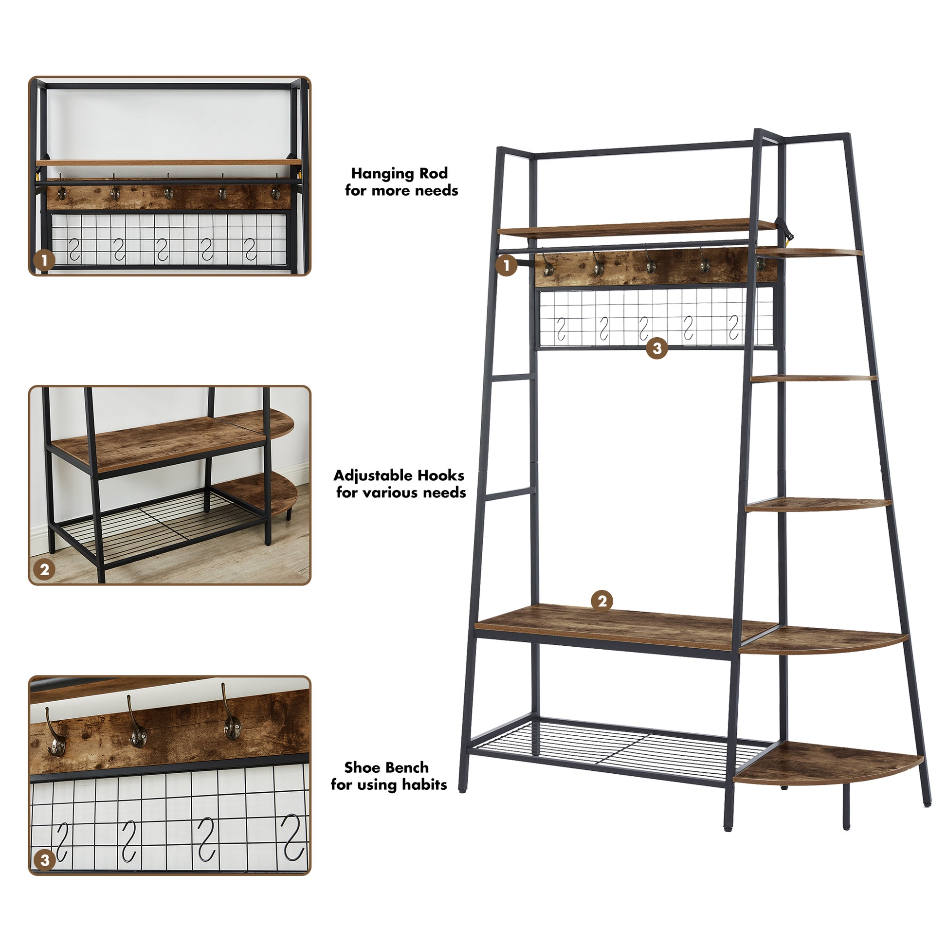 Modern Farmhouse Design with Premium Frame Materials: The coat rack is made of durable faux wood and premium frame material for easy assembly, and the black powder-coated frame ensures the stability of the entryway coat rack. When cleaning coat racks, dust and grime can be easily removed by wiping the frame and wood with a soft cloth.