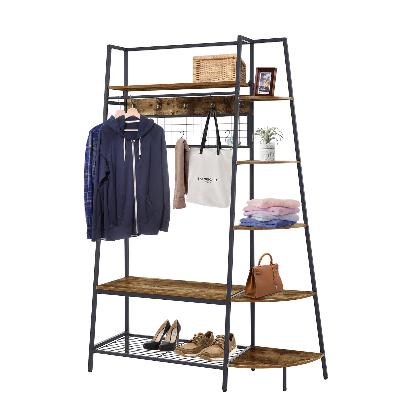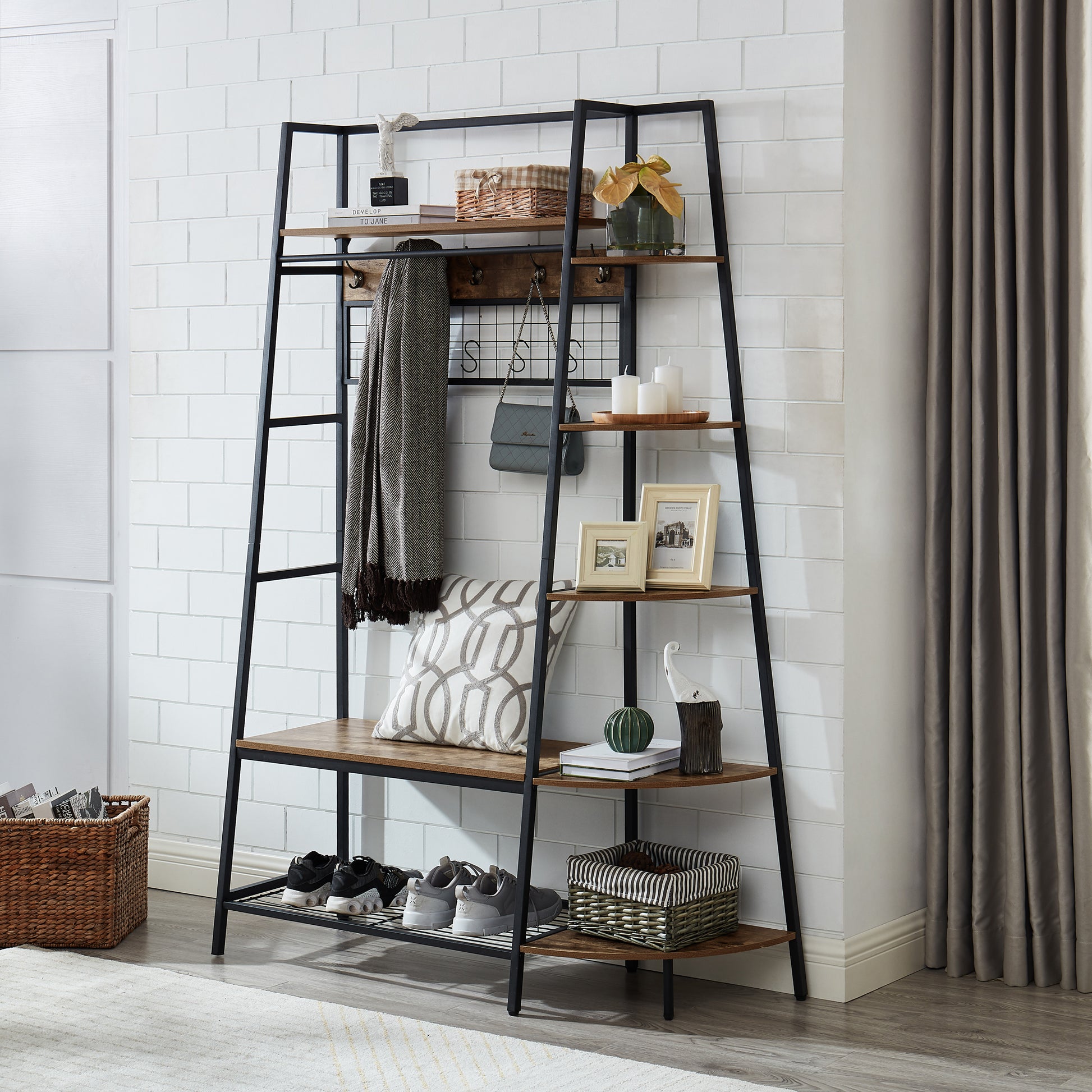 This entry coat rack with display area will be an attractive storage system in your home. The trapezoidal bookshelf can be used as extra storage for blankets, books and DVDs, or to display your favorite collectibles and photo frames. On top of this sturdy shoe cabinet, you'll find an extra shelf for home decor or indoor plants.