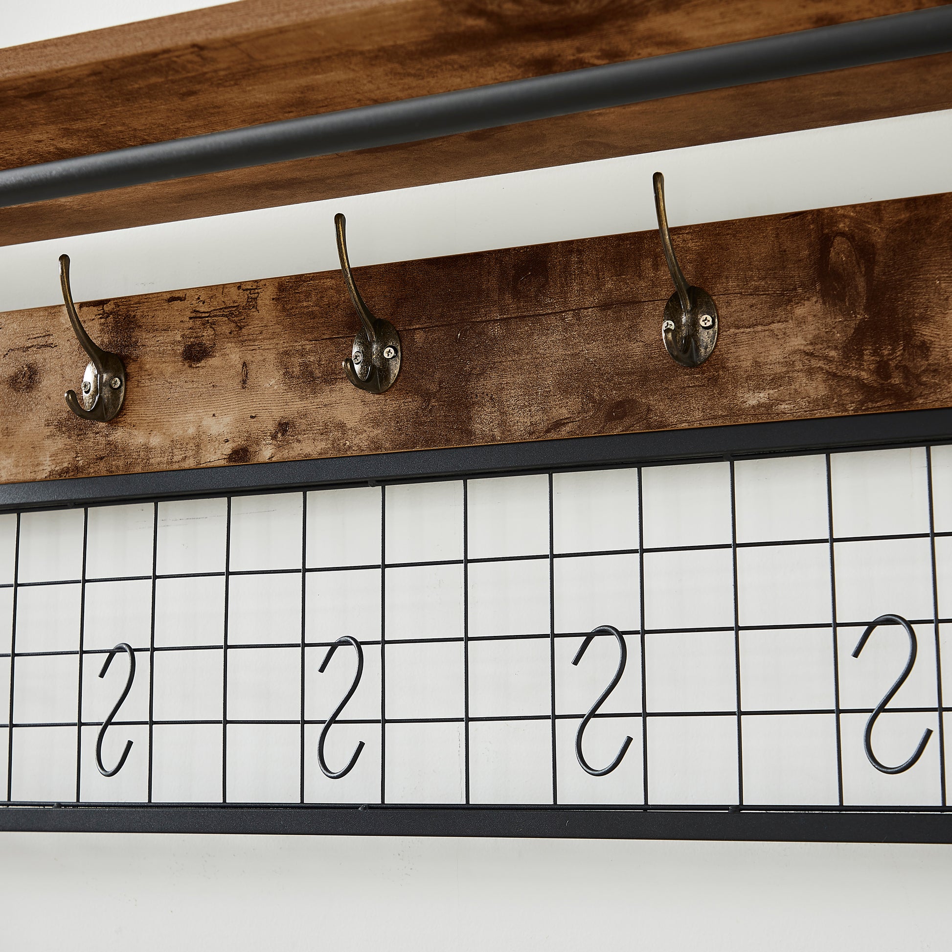 Comes with an 18" high bench for sitting and taking off your shoes for great convenience, and a shelf at the bottom of the bench to hold multiple pairs of shoes or boots. The grid area above the bench has S-shaped hooks for hanging smaller items like scarves and hats. Five black metal double coat hooks are sturdy enough to hold winter coats, backpacks and purses. The maximum bench seat weight is 220 lbs.